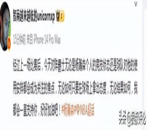媒体人“王健”发文:经过上一场比赛后,今天对阵爵士无论是杨瀚森个人的竞技状态还是球队对他的使用安排都会成为关注的焦点,无论如何只要在球场上拿出态度,无论结果如何,我都会一直支持你,好好加油吧。