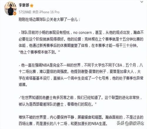 前方记者“李寒邻”发文提到杨瀚森目前现状:球队目前对小杨的表现没有担忧,no concern,甚至,从他的观点出发,瀚森不必要在这个阶段就表现得很好。他的论据:克林根在上个赛季就是十五分钟比赛的体能,他通过新秀赛季后的休赛期重塑了体格,在本赛季才能一场干三十分钟。“他上个赛季根本做不到。”