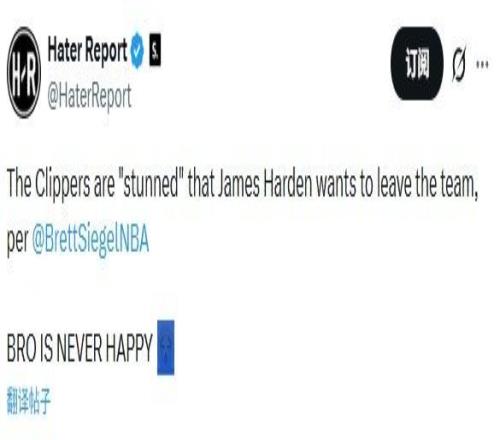 该美媒写道:“快船非常震惊哈登想要离开球队,这兄弟从来都不开心”。