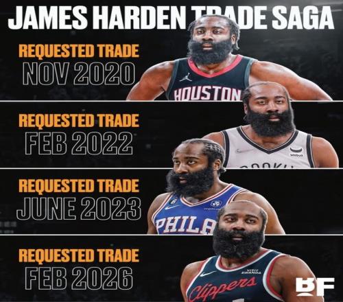 哈登被曝申请离队美媒晒四次交易申请图:哥们儿在哪都不开心
