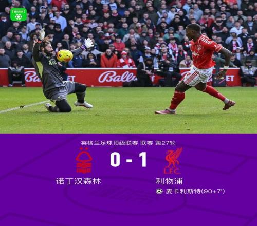 北京时间2月22日英格兰足球顶级联赛 联赛 第27轮,诺丁汉森林主场对阵利物浦。利物浦麦卡利斯特破门。最终比分诺丁汉森林 0-1 利物浦。
