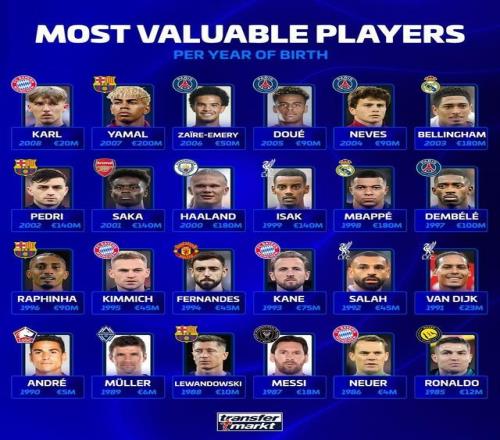德转列各年龄段身价最高球员榜:亚马尔2亿欧,姆巴佩贝林1.8亿欧