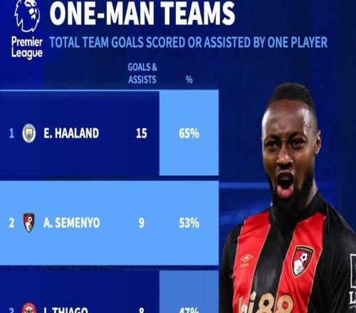11月18日,德转列出了英超本赛季参与进球占全队总进球比例的球员排名,哈兰德以65%排在了榜首,伯恩茅斯前锋塞门约排在了第二,同时塞门约上赛季至今的英超参与进球数排在了第六。